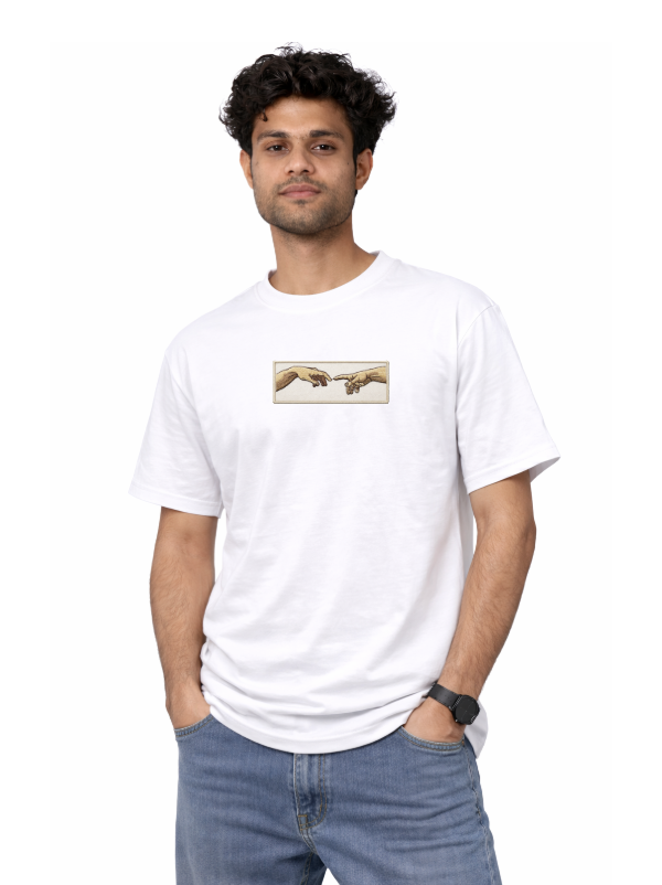This T-shirt features a finely detailed two-hands embroidery design, created using advanced machine embroidery for sharp and consistent stitching. The artwork captures a clean and artistic look, making it perfect for minimal and modern styling.